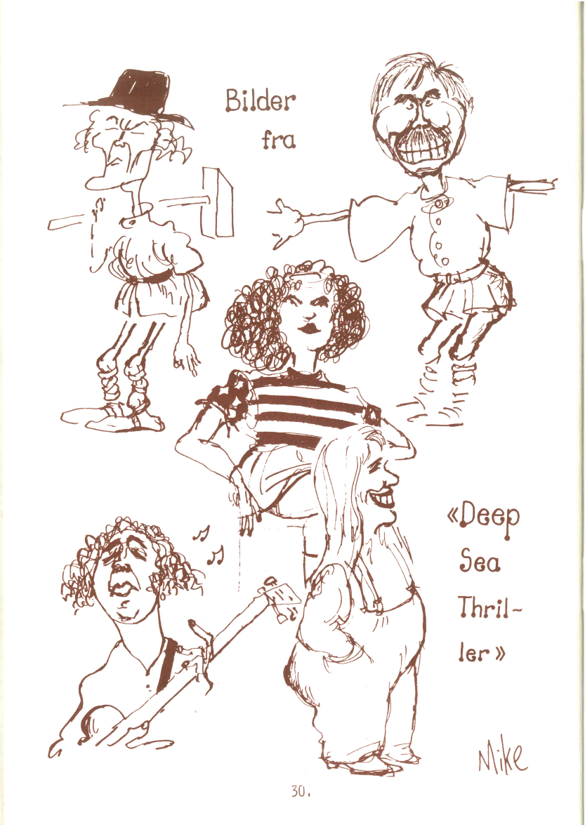 Tegning fra Tramteatrets produksjon Deep Sea Thriller (1977). Tegningen ble publisert i programmet til Hvem er redd for Frøken Lunde? . Tegnet av: Ukjent.