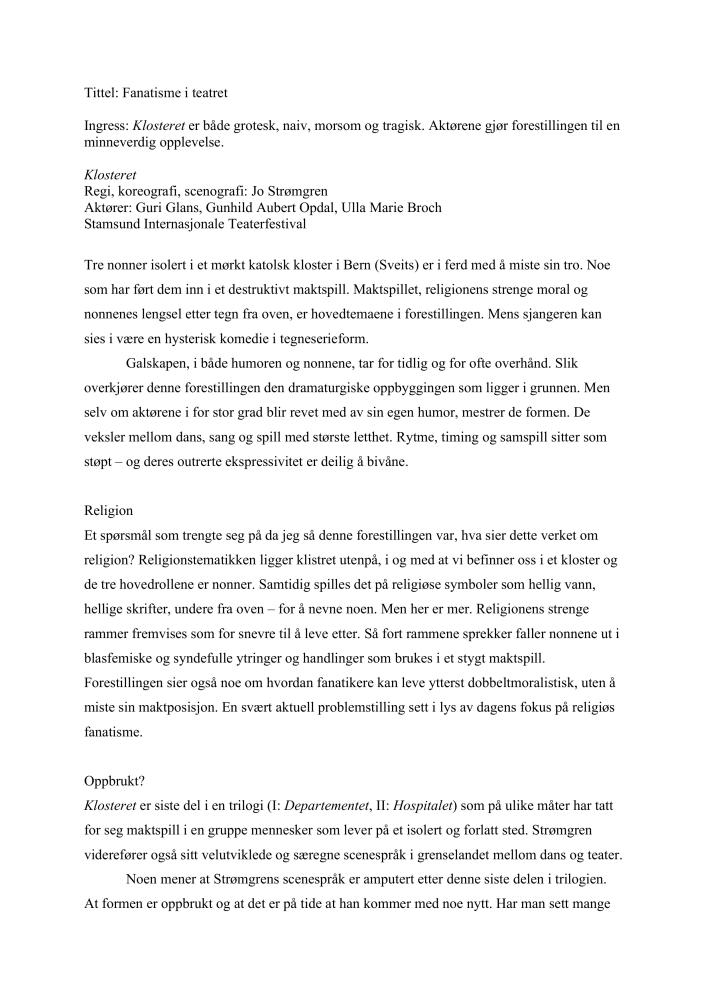 Fanatisme i teatret. Anmeldelse av Jo Strømgren Kompanis produksjon Klosteret (2006). Anmeldelsen ble publisert i Dagsavisen 8. juni 2006.