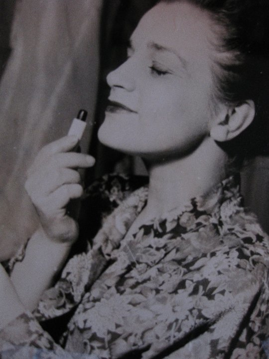 Portrett av skuespiller Bjørg Svendsen (1923-2011). I garderoben før forestilling. Foto: ukjent