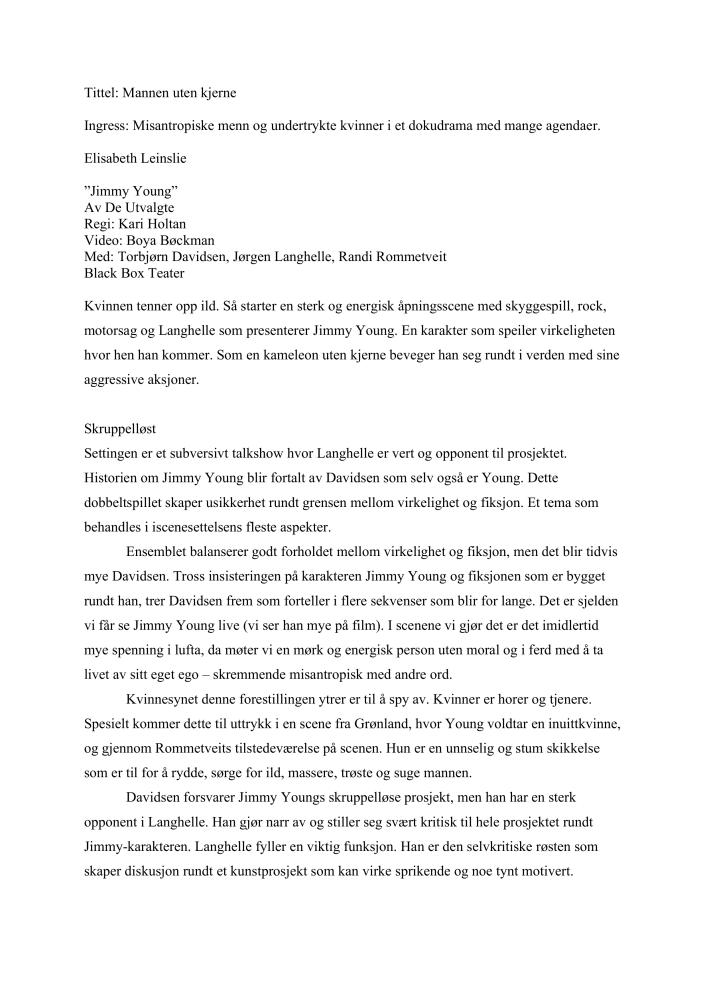 Anmeldelse av Elisabeth Leinslie i Dagsavisen av De Utvalgtes produksjon "Jimmy Young" (2007)