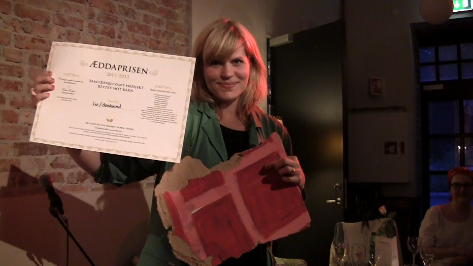 Fotografi fra Æddaprisutdelingen 2012, Miriam Prestøy Lie (dramatiker Urmakarens Hjarte) mottar prisen på vegne av Urmakarens Hjarte, i kategorien Samtidsrelevant prosjekt rettet mot barn 2012. Foto: Marius Kolbenstvedt