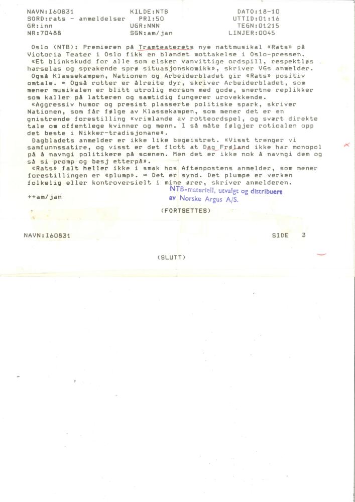 NTBs oversikt over anmeldelser av Tramteatrets produksjon Rats (1985)