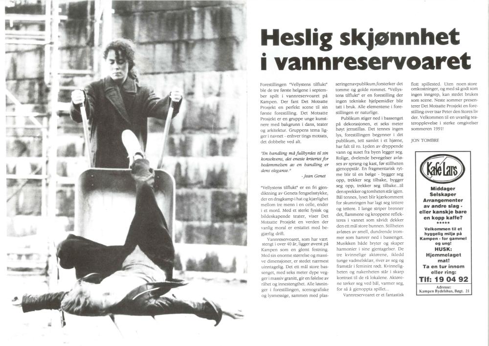 Heslig skjønnhet i vannreservoaret. Artikkel om Det Motsatte Prosjekts prosjekt Vellystens Tilflukt (1990). Artikkelen ble publisert i Kampenposten 15. årgang nr. 2 november 1990.