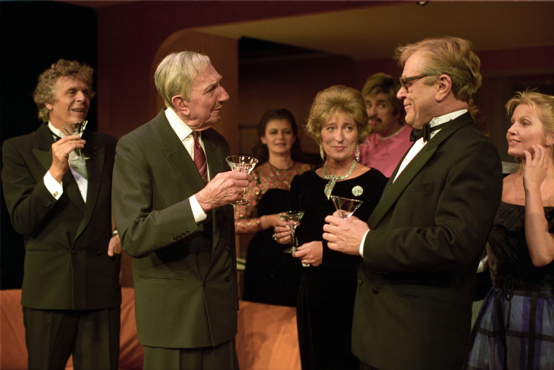 Scene fra Nationaltheaterets oppsetning av Alan Ayckbourns "Monki Bisniss". Lars Andreas LArssen (som Desmond), Leif Juster (som Ken Ayres), Tone Schwarzott (som Yvonne), Tor Stokke (som Jack) og Anitra Terese Eriksen (som Tina) snakker sammen med cocktailglass i hendene. Forestillingen hadde premiere 8. september 1989. Toralv Maurstad hadde regi og medvirkende var blant annet Tor Stokke som Jack, Kari Simonsen som Poppy og Leif Juster som Ken Ayres.