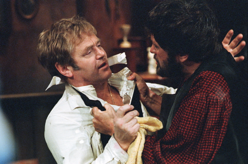 På bildet: Tor Stokke, skuespiller (1928-2003), og Kai Remlov, skuespiller (1946-)