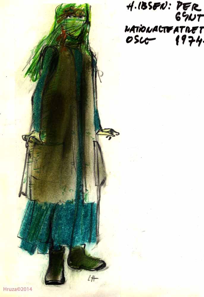 Kostymetegning av Lubos Hruza fra produksjonen av Henrik Ibsens Peer Gynt (1975), Nationaltheatret. Forestillingen hadde premiere 20. mars 1975 på Nationaltheatrets Hovedscene.