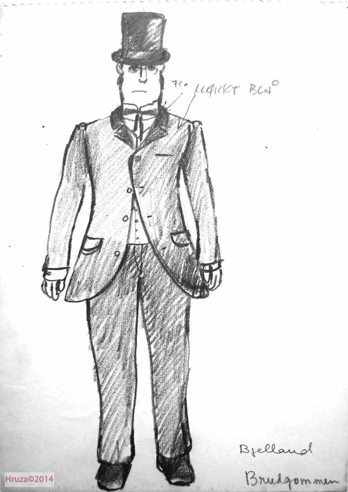 Kostymetegning av Lubos Hruza til Gerhard Bjelland i rollen som Brudgommen i produksjonen av Henrik Ibsens Peer Gynt (1975), Nationaltheatret. Forestillingen hadde premiere 20. mars 1975 på Nationaltheatrets Hovedscene.