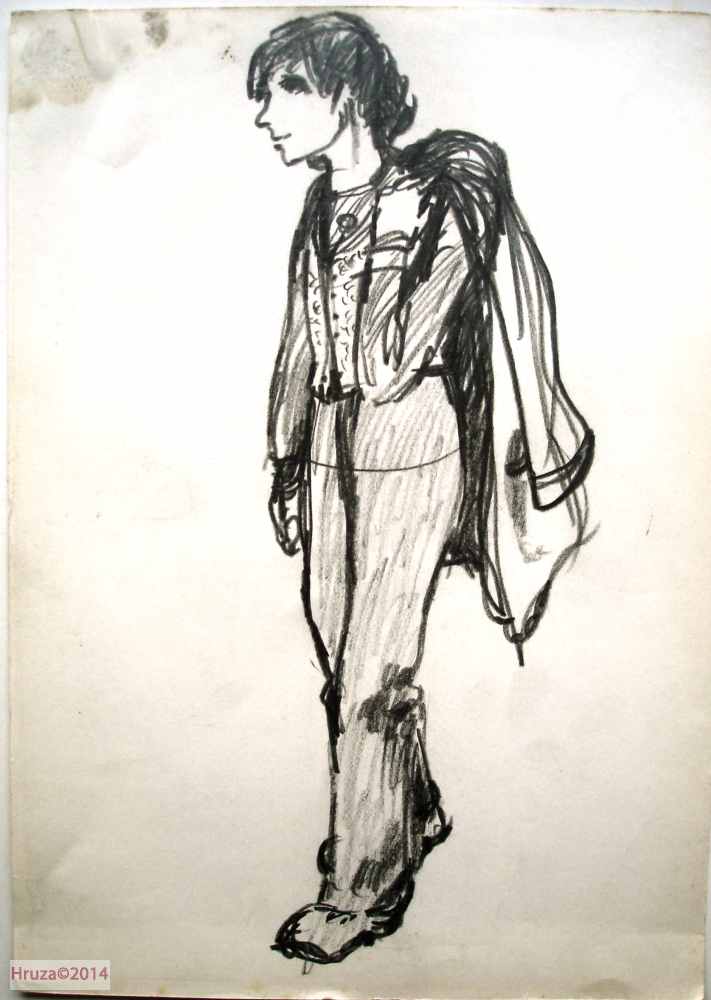 Kostymetegning av Lubos Hruza til Svein Sturla Hugnes i rollen som Brudgommen i produksjonen av Henrik Ibsens Peer Gynt (1975), Nationaltheatret. Forestillingen hadde premiere 20. mars 1975 på Nationaltheatrets Hovedscene.
