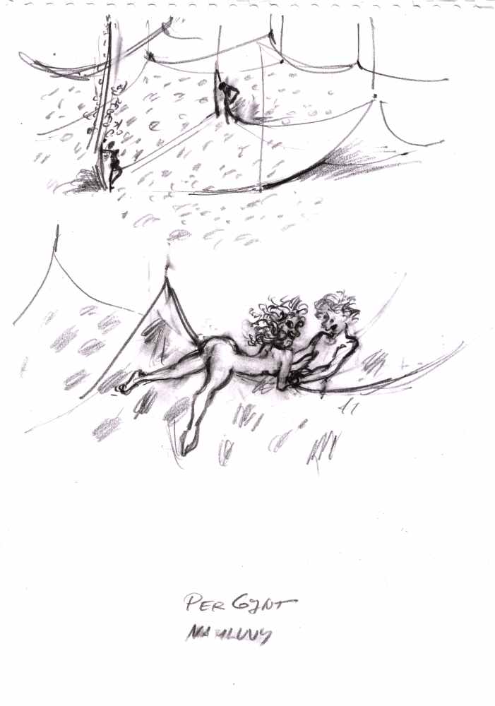 Tegning av Lubos Hruza av en scene fra Peer Gynt, 1975, Nationaltheatret