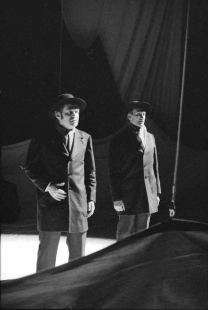 På bildet: Peer Gynt, her spilt av Tor Stokke, står framme på scenen, mens Knut Wigert spiller den fremmede passasjeren. Sistnevnte tar over rollen som Peer Gynt mot slutten av stykket.