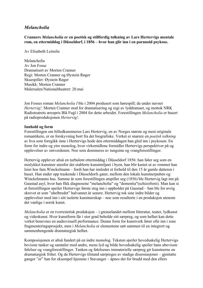 Anmeldelse av Elisabeth Leinslie i Norsk Shakespeare- og teatertidsskrift av Nationaltheatrets produksjon "Melancholia" (2005)