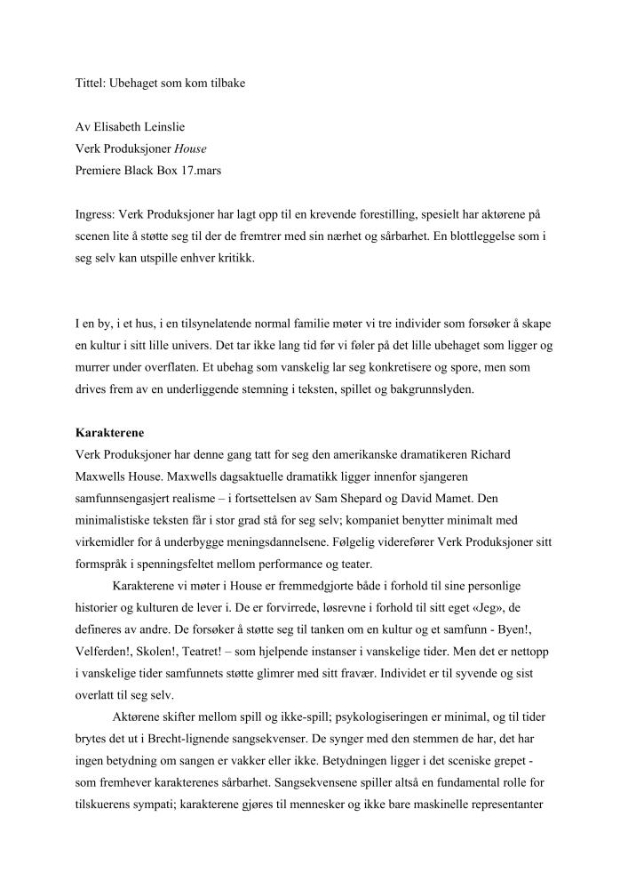 Ubehaget som kom tilbake. Anmeldelse av Verk produksjoners produksjon House (2005). Anmeldelsen ble publisert i Morgenbladet 25. mars 2005.