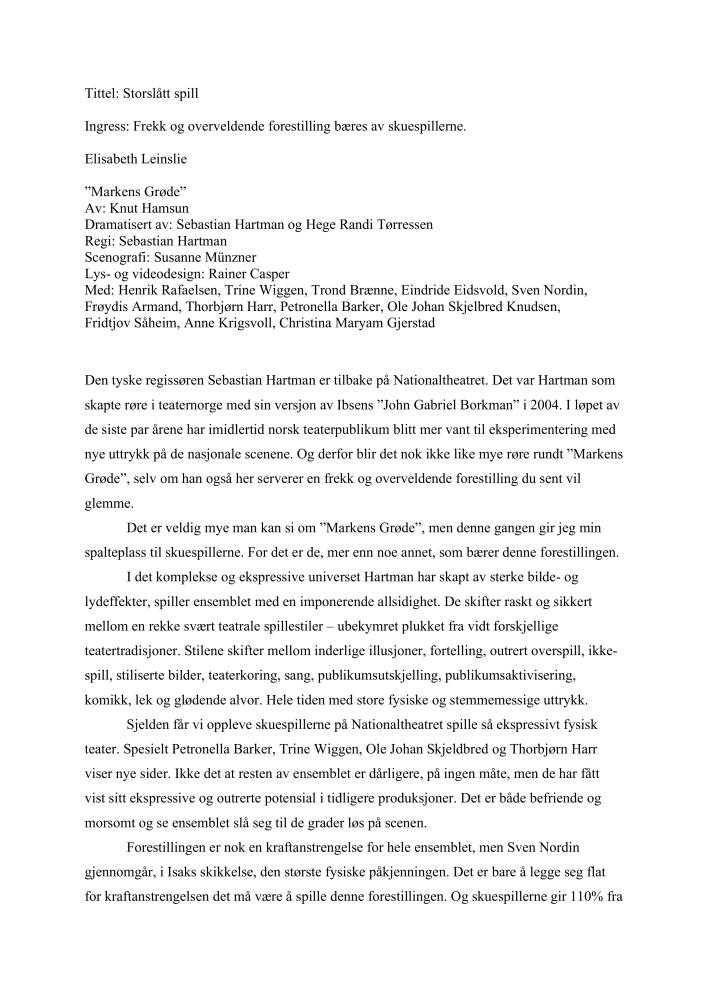 Anmeldelse av Elisabeth Leinslie i Dagsavisen av Nationaltheatrets produksjon "Markens Grøde" (2007)