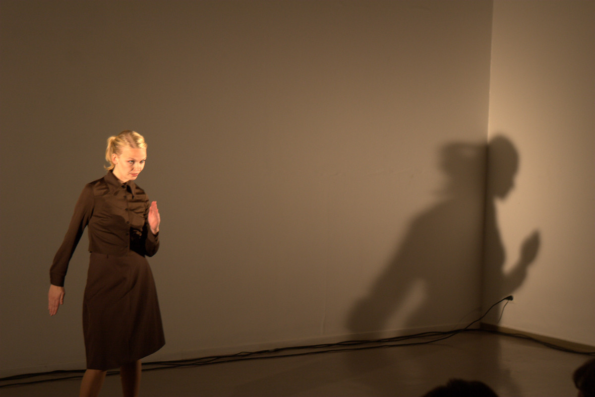 Foto fra Ann Kristin Bergesens visning av performancen Tap Performance under Kunstbanken Hedmark Kunstsenters performancefestival 2005.