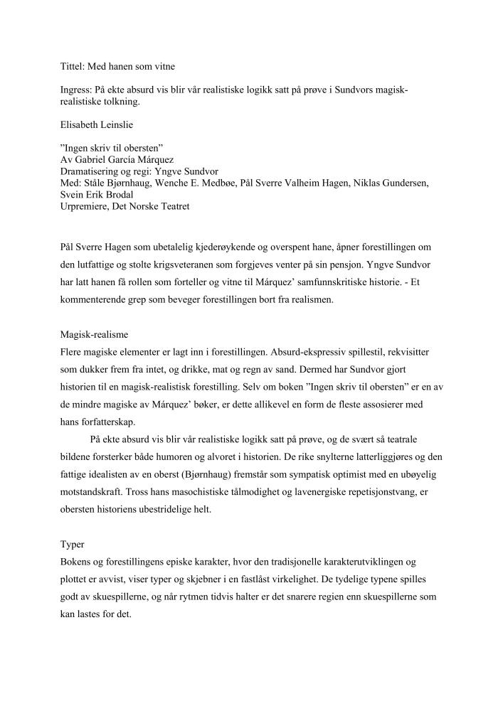 Med hanen som vitne. Anmeldelse av Det Norske Teatrets produksjon Ingen skriv til obersten (2007). Anmeldelsen ble publisert i Dagsavisen 3. mars 2007.