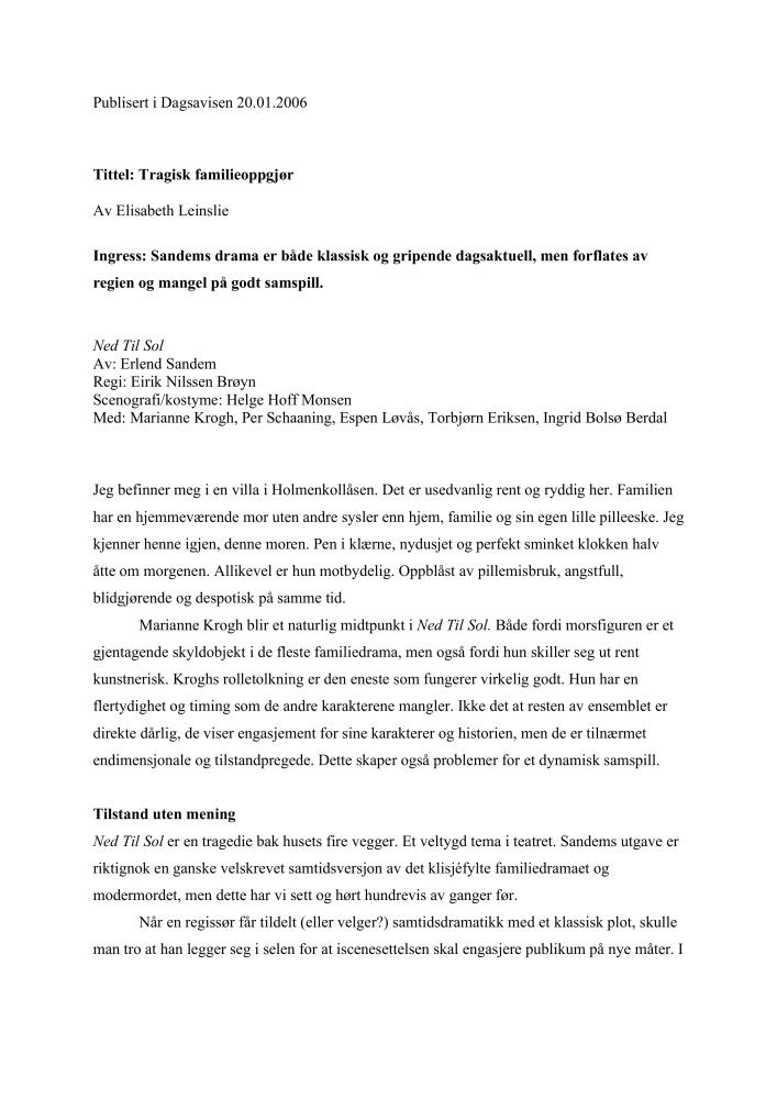 Tragisk familieoppgjør. Anmeldelse av Det Norske Teatrets produksjon Ned til sol (2006). Anmeldelsen ble publisert i Dagsavisen 20. januar 2006.