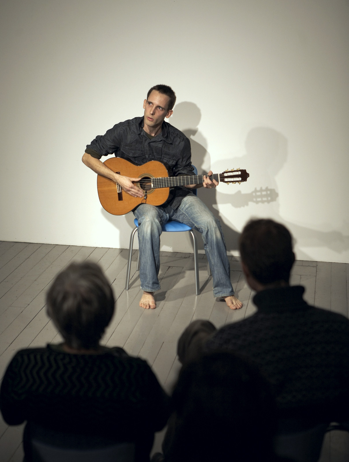 Foto fra Rasmus Jørgensens performance baby left, nei, oh-yeah-yeah, hysj, vist under Kunstbanken Hedmark Kunstsenters performancefestival 28.10.2006 og 29.10.2006.