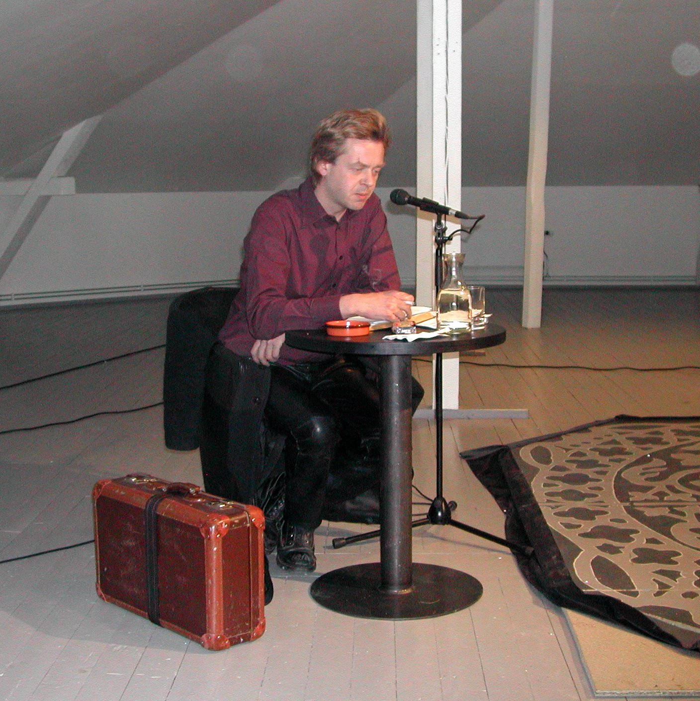Foto fra performanceopplesningen Tekster (også omtalt som Helter Skelter) av Tommy Olsson, fremført under Kunstbanken Hedmark Kunstsenters Performancefestival 12.10.2003.