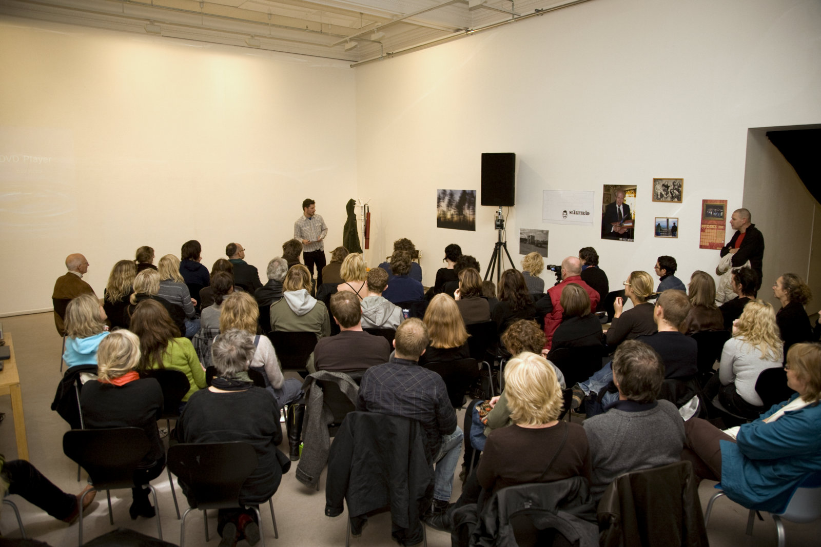 Foto fra performancen The Power of Anti-by (2007) av Tomas Håkki Eriksson, vist under Performancefestivalen 2007 i Kunstbanken Hedmark Kunstsenter.
