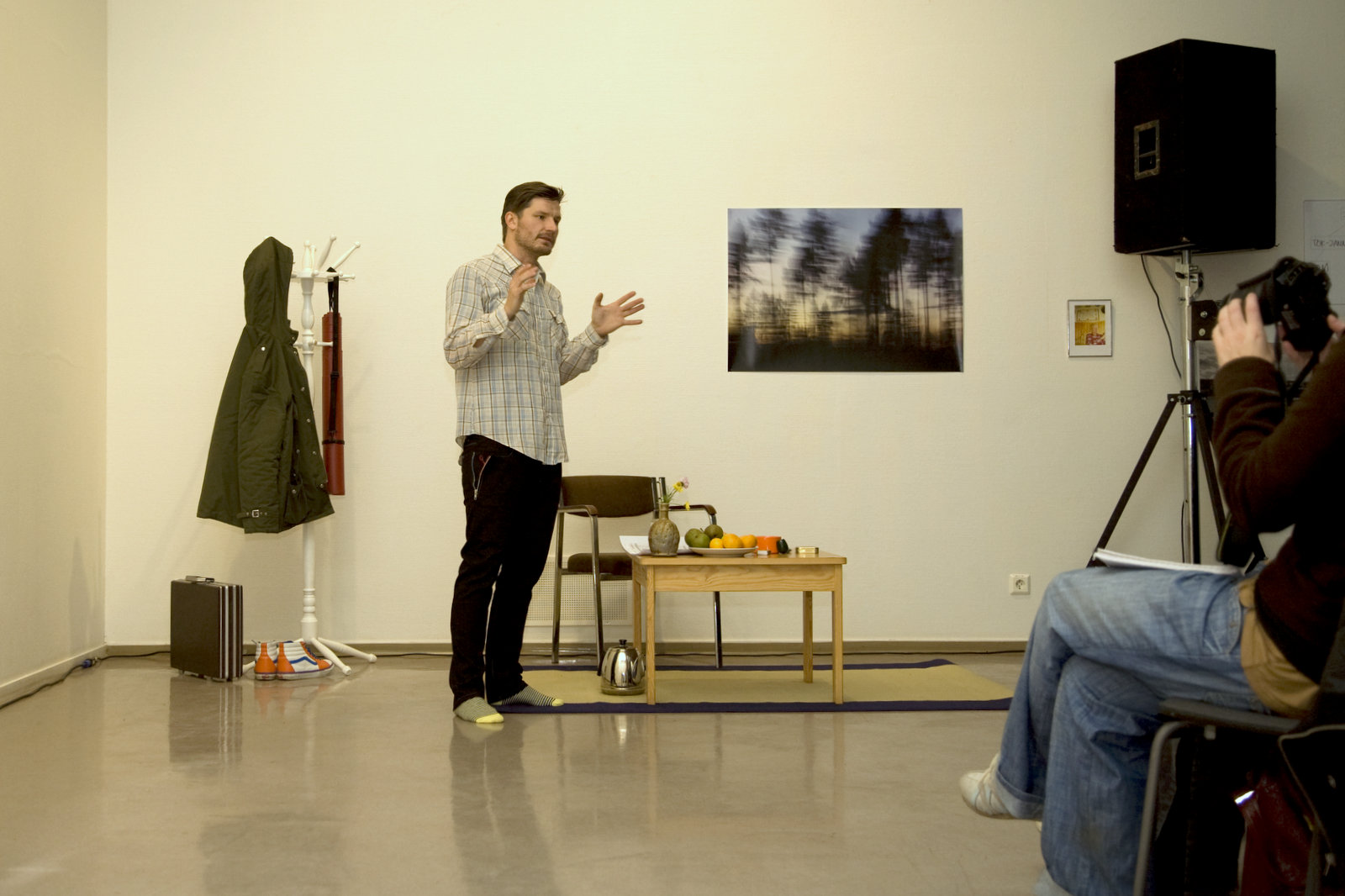 Foto fra performancen The Power of Anti-by (2007) av Tomas Håkki Eriksson, vist under Performancefestivalen 2007 i Kunstbanken Hedmark Kunstsenter.