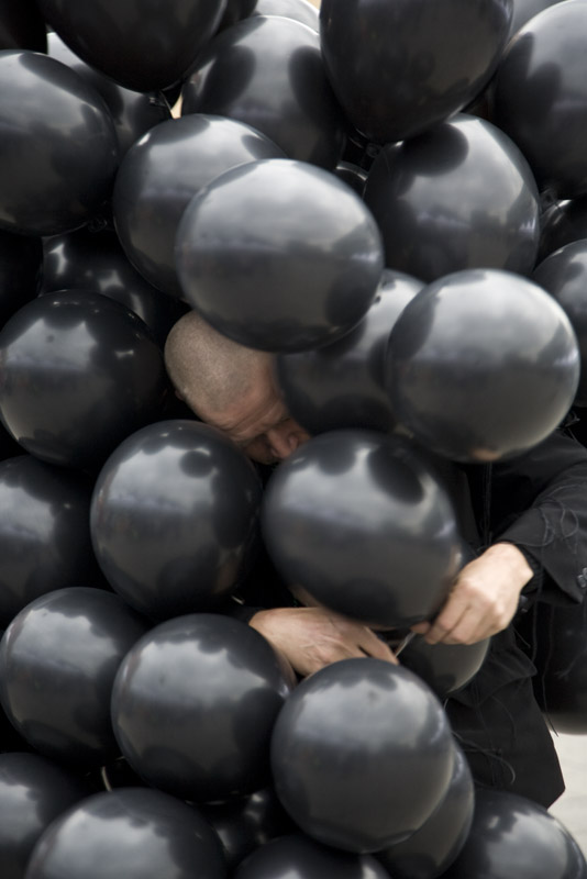 Foto fra performancen Balloon Man av Roi Vaara, vist utendørs i Hamar sentrum under Performancefestivalen 2007 i Kunstbanken Hedmark Kunstsenter.