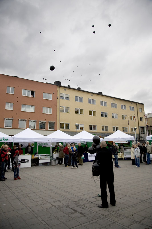Foto fra performancen Balloon Man av Roi Vaara, vist utendørs i Hamar sentrum under Performancefestivalen 2007 i Kunstbanken Hedmark Kunstsenter.