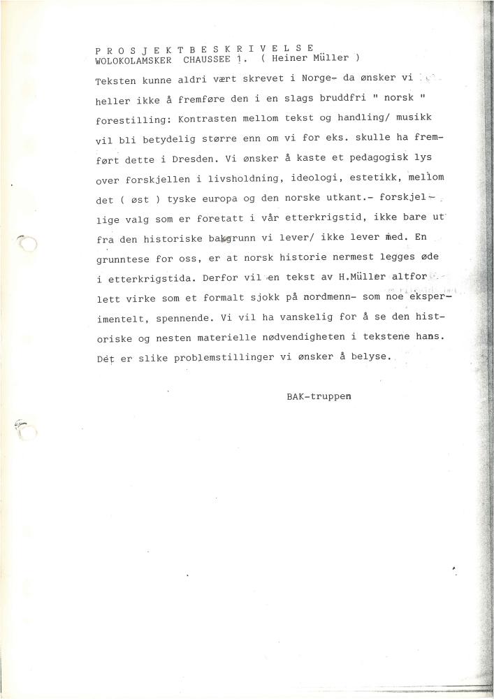 Prosjektbeskrivelse (utdrag) av Baktruppens produksjon "Germania Tod in Berlin" (1989)