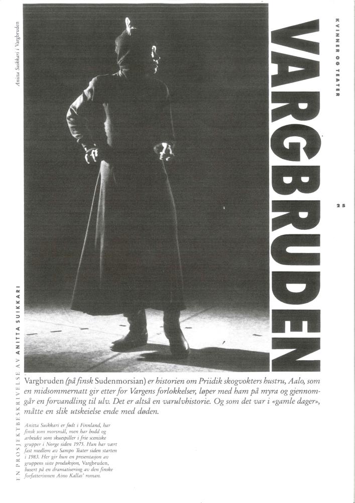 Artikkel av Anitta Suikkari i Spillerom om Sampo Teaters produksjon "Vargbruden" (1988)