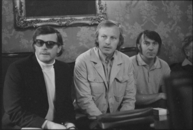 Regissøren Jan Kačer, tsjekkiske-norske tolken Lubo Mauer og scenografen Lubos Hrůza fra Nationaltheatrets oppsetning av Anton Tsjekhovs Kirsebærhaven. Produksjonen hadde premiere 22. september 1971.
