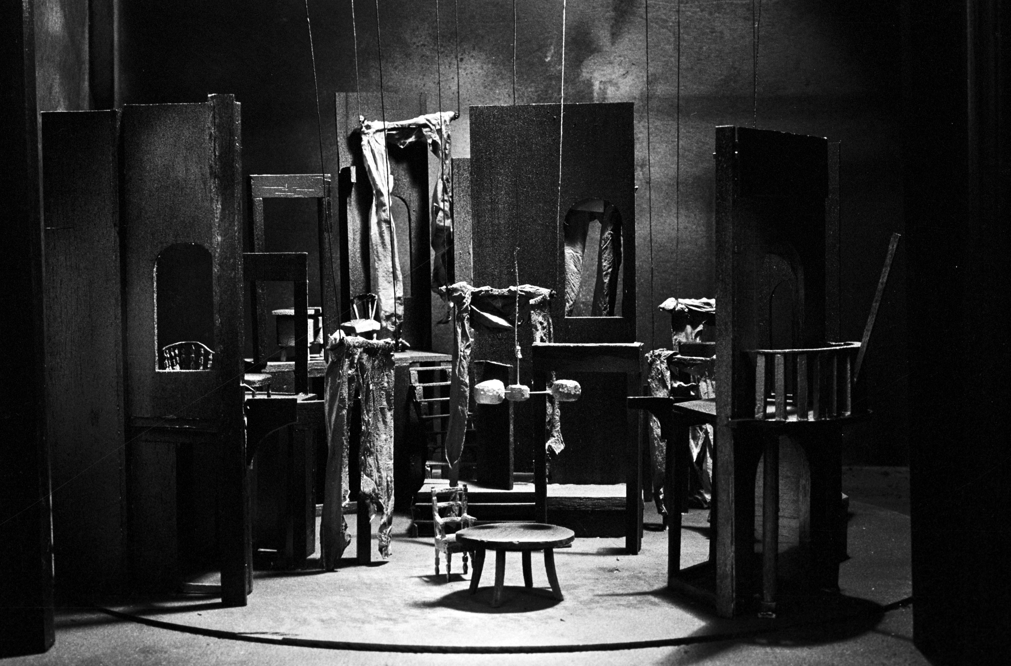 Fotografi av scenografimodellen til Nationaltheaterets oppsetning av Spøksonaten (1972) av August Strindberg.
