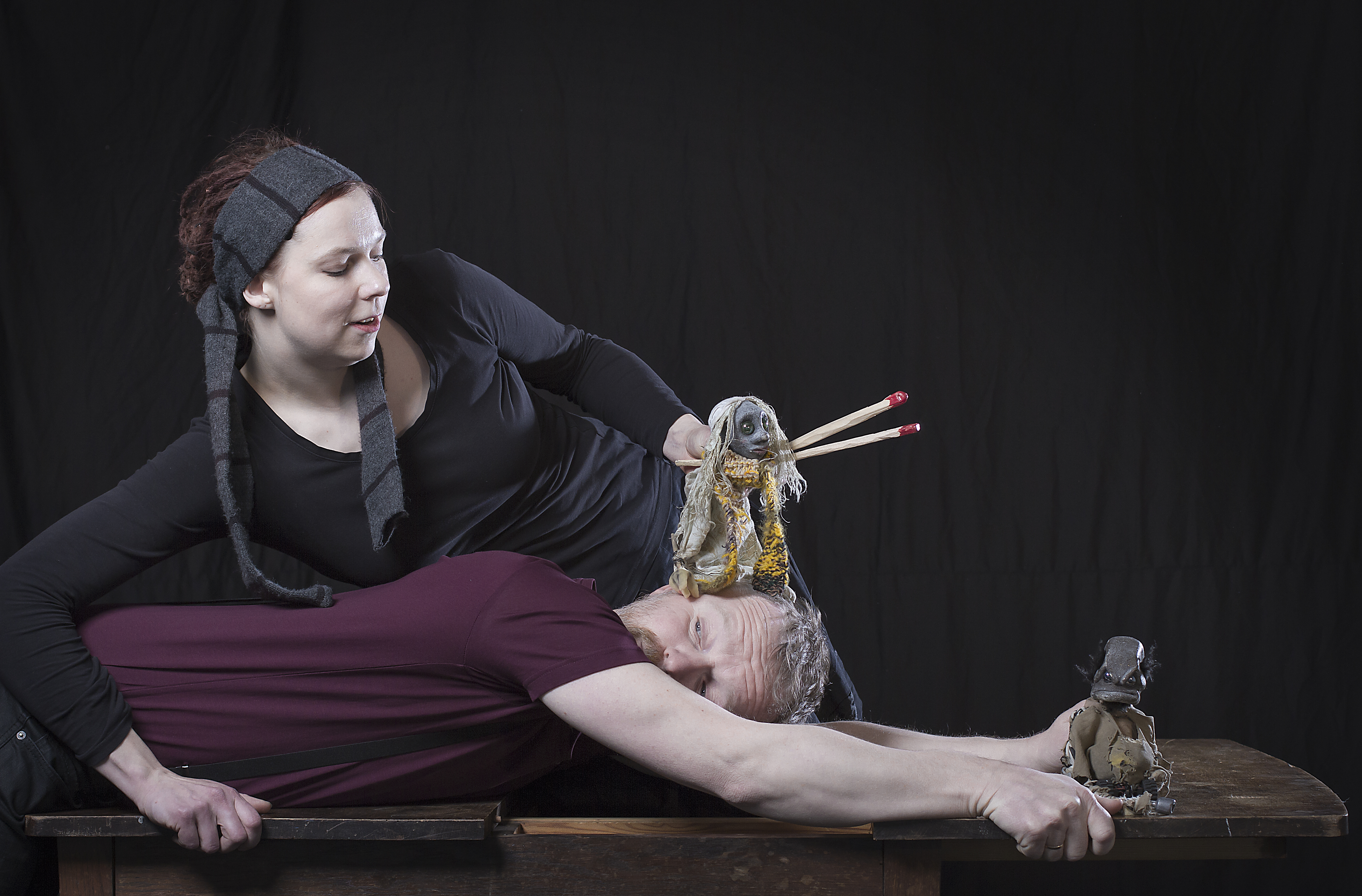 Fotografi fra Kattas Figurteater Ensembles produksjon Grå Gubber leker med fyrstikker (2019)