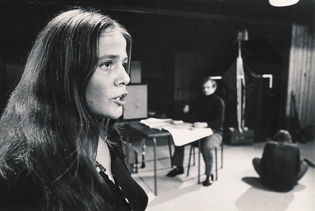 Fotografi fra Musidra Teaters produksjon Fugleskremsel (1972). En musikkdramatisk collage av Musidra Teater, våren 1972. Regi: Helge Reistad i samarbeid med Eyvind Solås. Tekst: Kent Andersson.