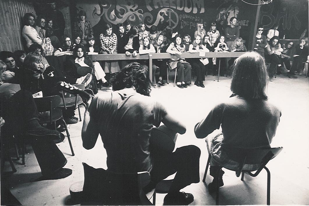 Fotografi fra Musidra Teaters produksjon Fugleskremsel (1972). En musikkdramatisk collage av Musidra Teater, våren 1972. Her: «Vivaldi». Regi: Helge Reistad i samarbeid med Eyvind Solås. Tekst: Kent Andersson.