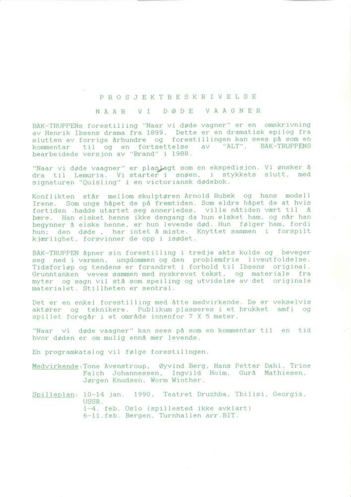 Prosjektbeskrivelse til Baktruppens produksjon "Når vi døde våkner" (1990)