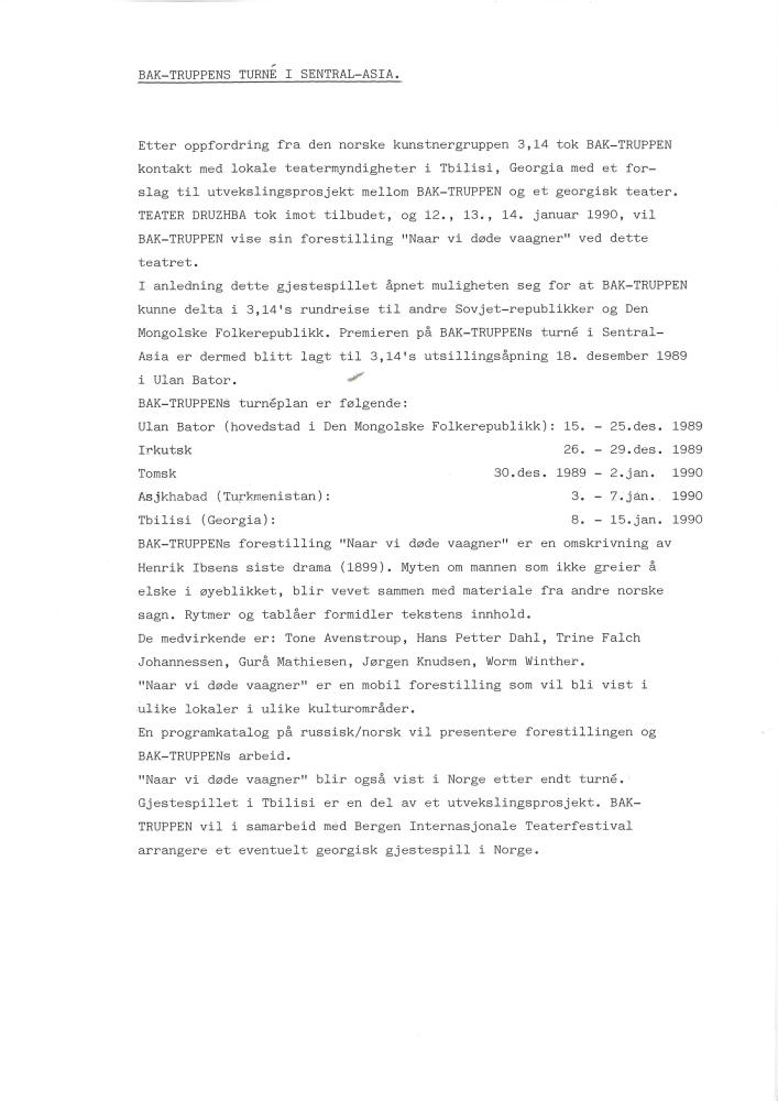 Turneplan i Asia i forbindelse med Baktruppens produksjon "Når vi døde våkner" (1990)