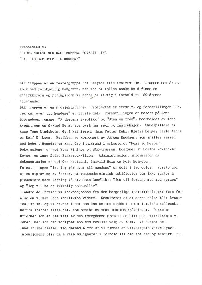 Pressemelding for Baktruppens produksjon Jeg går over til hundene (1987).