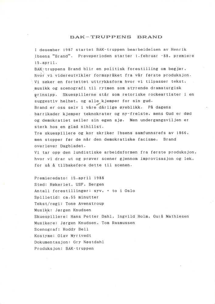 Informasjonsark til Baktruppens produksjon "Alt" (1988)