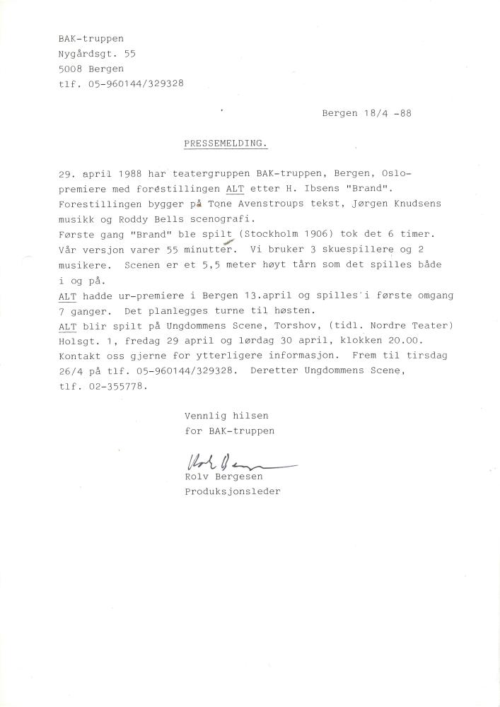 Pressemelding i forbindelsen med Baktruppens produksjon Alt (1988)