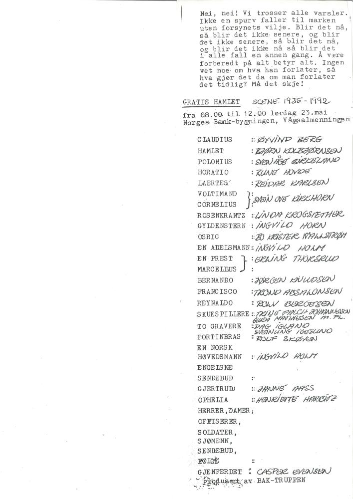 Flyer til Baktruppens produksjon Gratis Hamlet (1992).