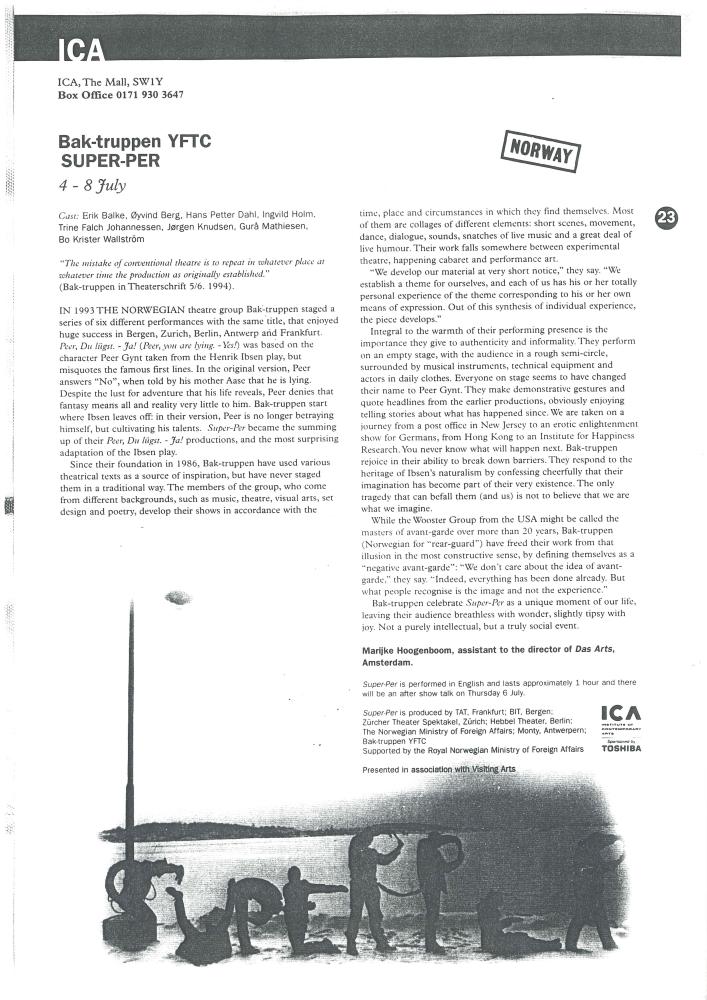 Programomtale av Baktruppens produksjon "Super-Per" (1994) fra forestillingen som ble spilt på ICA Institute of Contemporart Arts i London.