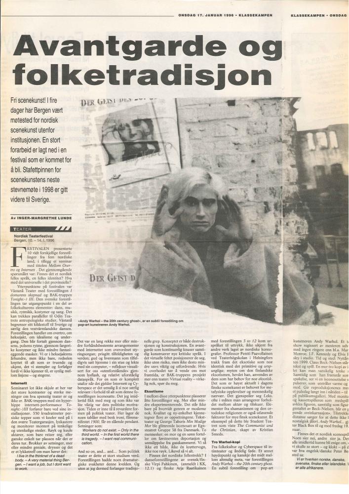 Avantgarde og folketradisjon, omtale av Baktruppens produksjon Tonight :) (1994). Publisert 17. januar 1996 i Klassekampen.