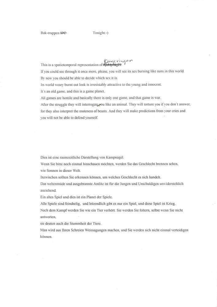 Infoark, av Baktruppens produksjon "Tonight :-)" (1994) i engelsk og tysk versjon.