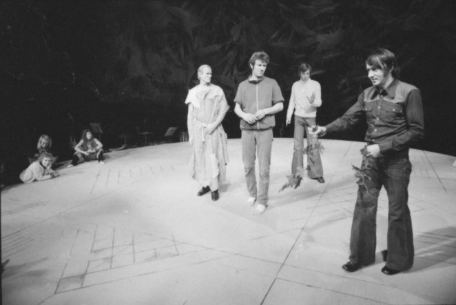 Fotografi er fra prøvene til Nationaltheatrets oppsetning av Euripides Bakkantinnene. Produksjonen hadde premiere 24. februar, 1973.