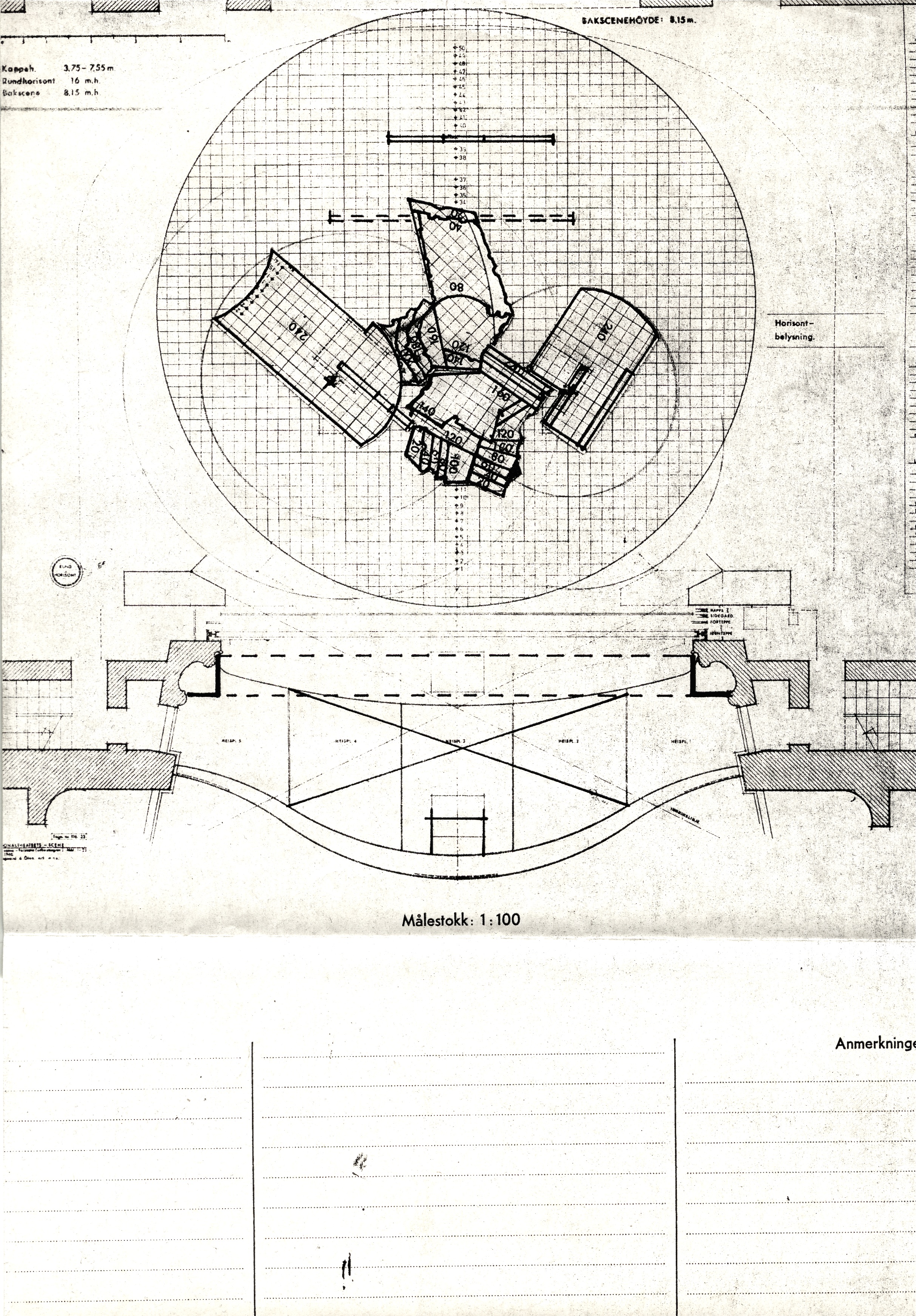 Teknisk tegning av scenografien til Nationaltheatrets produksjon Catilina (1976)