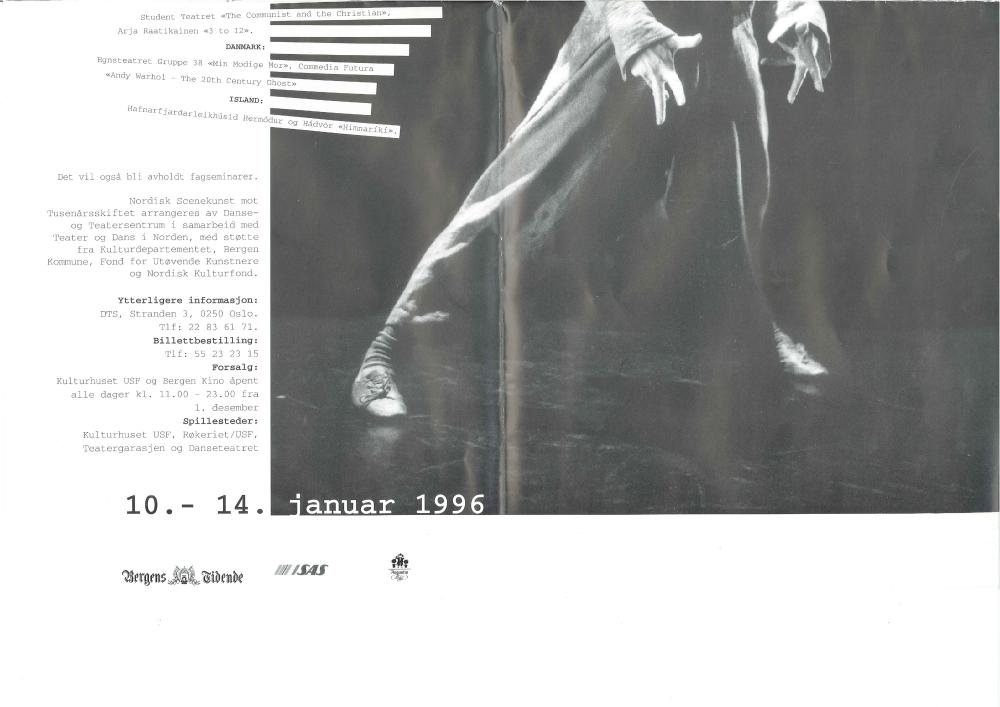 Flygeblad for festivalen Nordisk Scenekunst mot Tusenårsskifte (1996). Festivalen ble arrangert i Bergen av Danse- og teatersentrum.