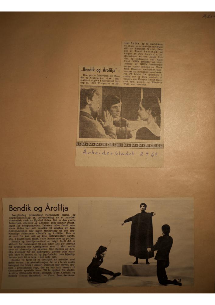 Bendik og Årolilja. Forhåndsomtale av NRKs produksjon Bendik og Årolilja (1969). Publisert i Arbeiderbladet 2. april 1969
