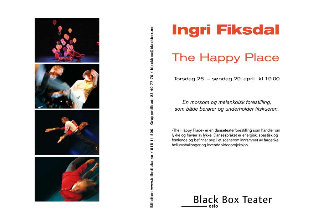 Program for Ingri Midgard Fiksdal Dans' produksjon The Happy Place (2006). Plakaten er fra forestillingene på Black Box Teater i Oslo i april 2007.