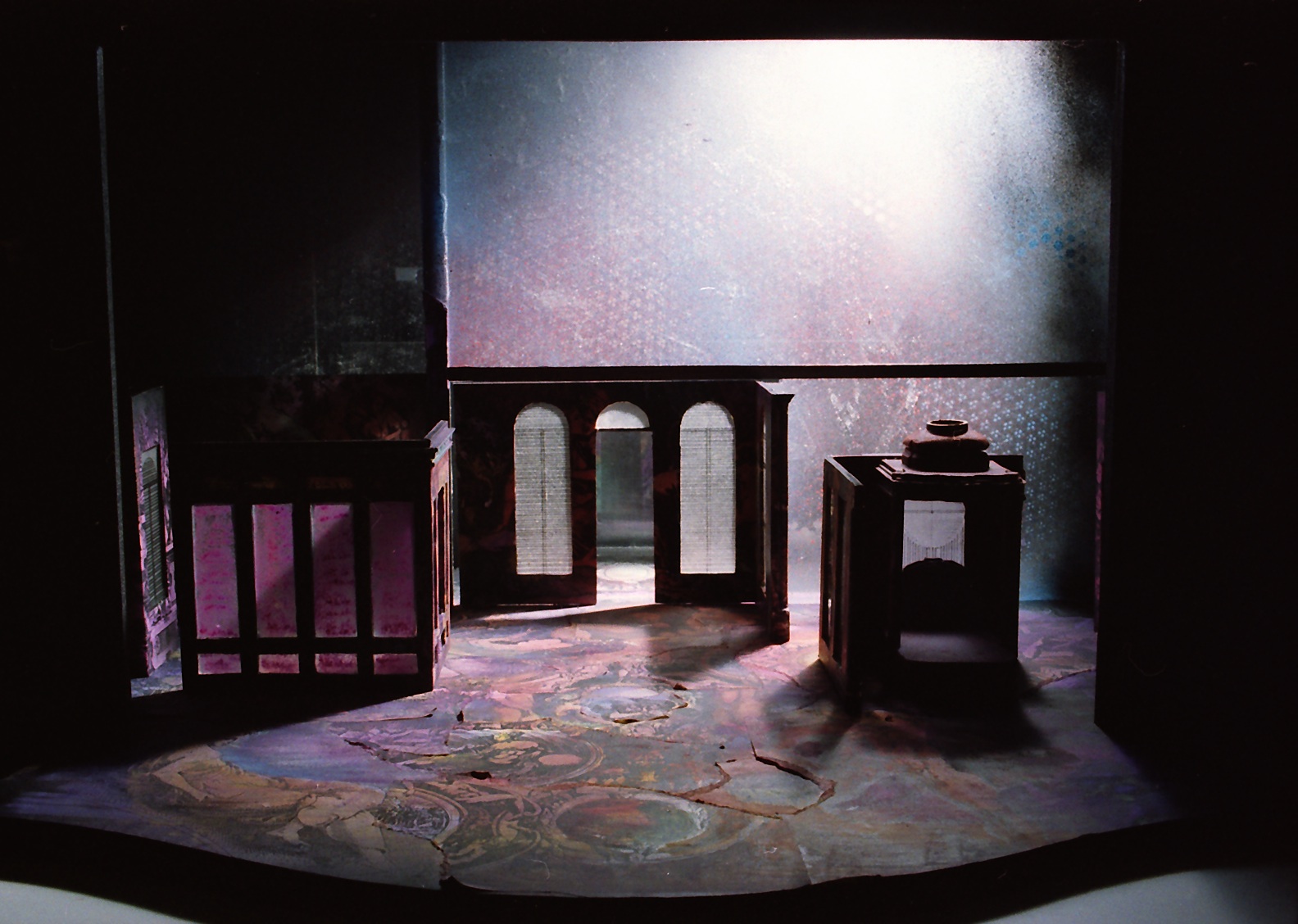 Fotografi av scenografimodellen til Nationaltheatrets produksjon Farlig forbindelser (1988)
