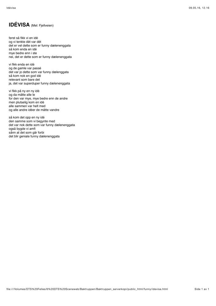 Sangtekster i forbindelse med av Baktruppens produksjon "Funny" (2003) / Idévisa.