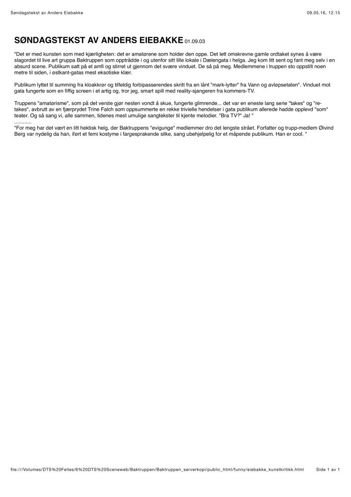 Anmeldelse av Baktruppens produksjon "Funny" (2003). Publisert 01.09.2003, Kunstkritikk.no.